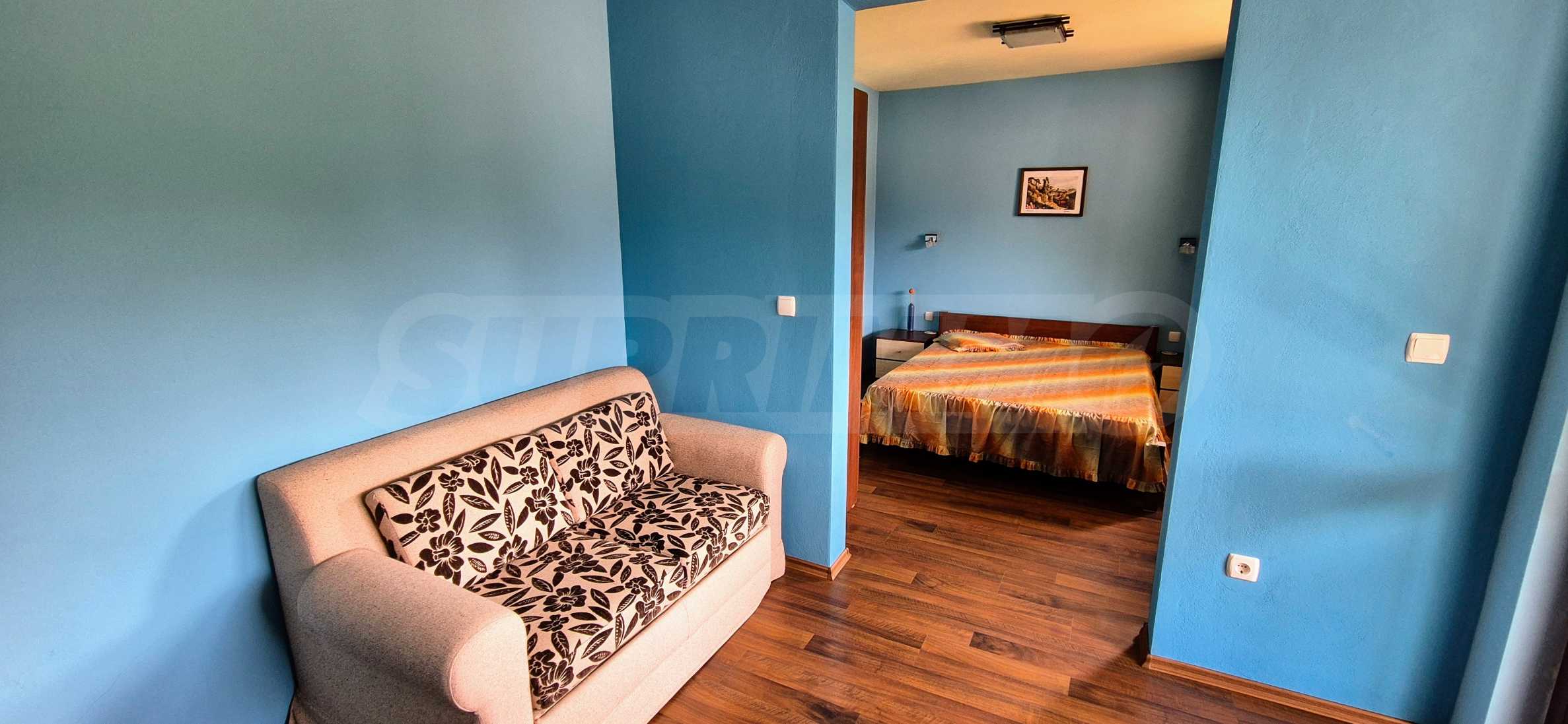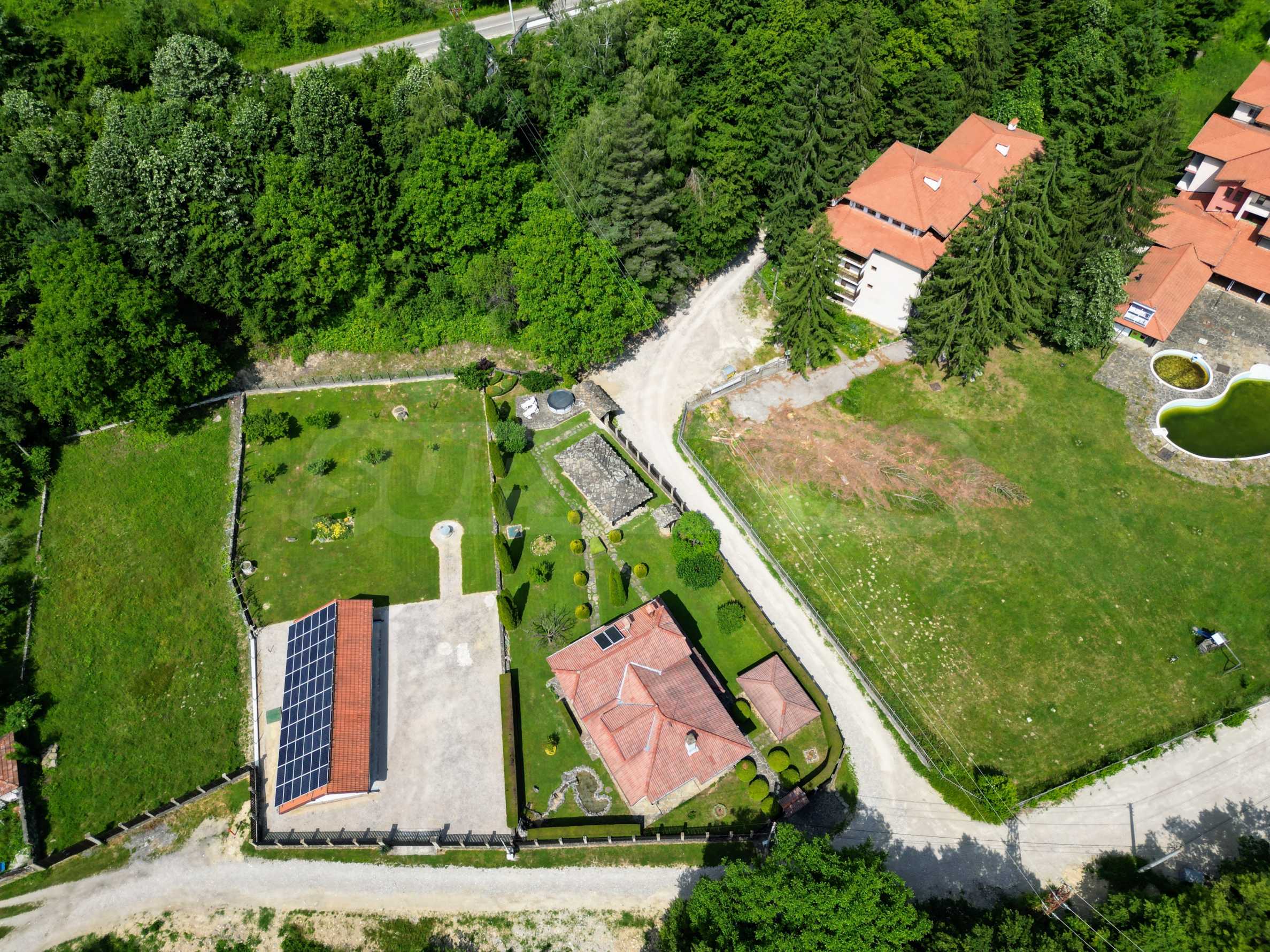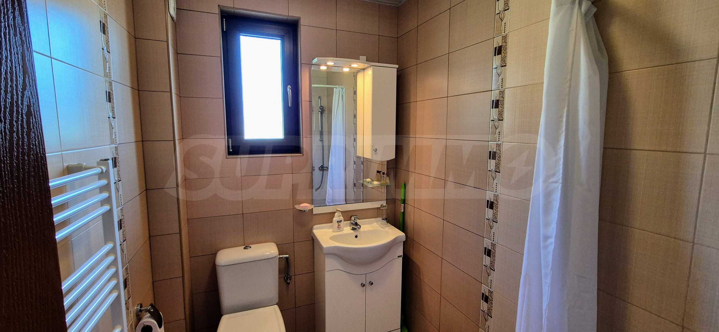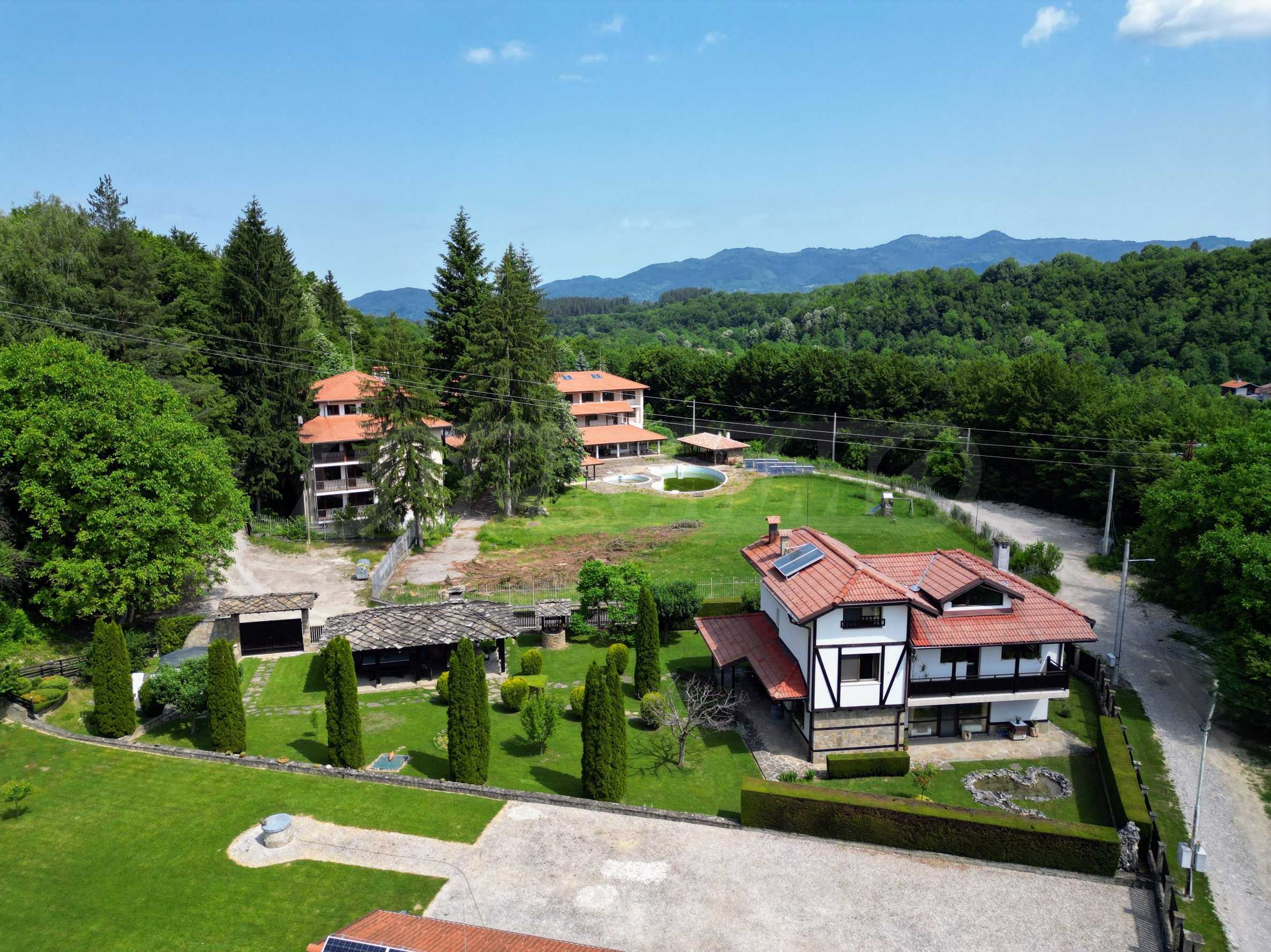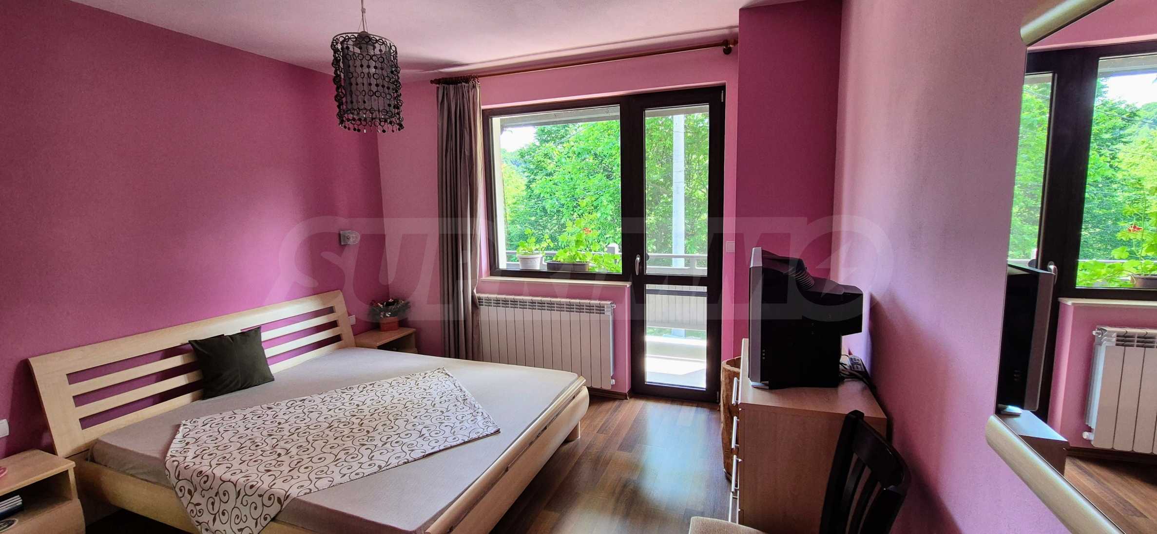 Dom posiada przestronny salon z bezpośrednim wyjściem na podwórko, kominek, jadalnię i aneks kuchenny, toaletę, kotłownię, 3 sypialnie i 2 studia z 5 łazienkami i toaletami z naturalną wentylacją, 2 panoramiczne tarasy z niesamowity widok, klatka schodowa i granitowe platformy. W salonie i kotłowni płytki granitowe, w sypialniach parkiet laminowany. Do sprzedania z całym umeblowaniem.