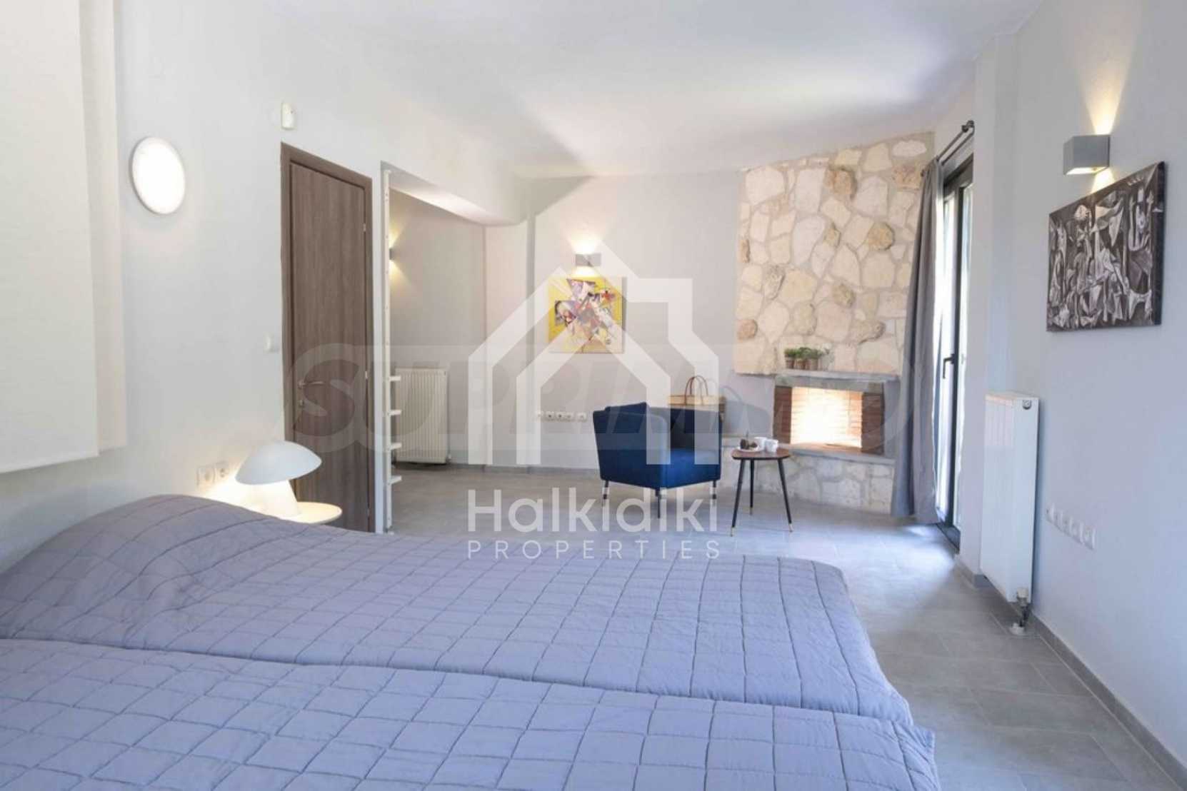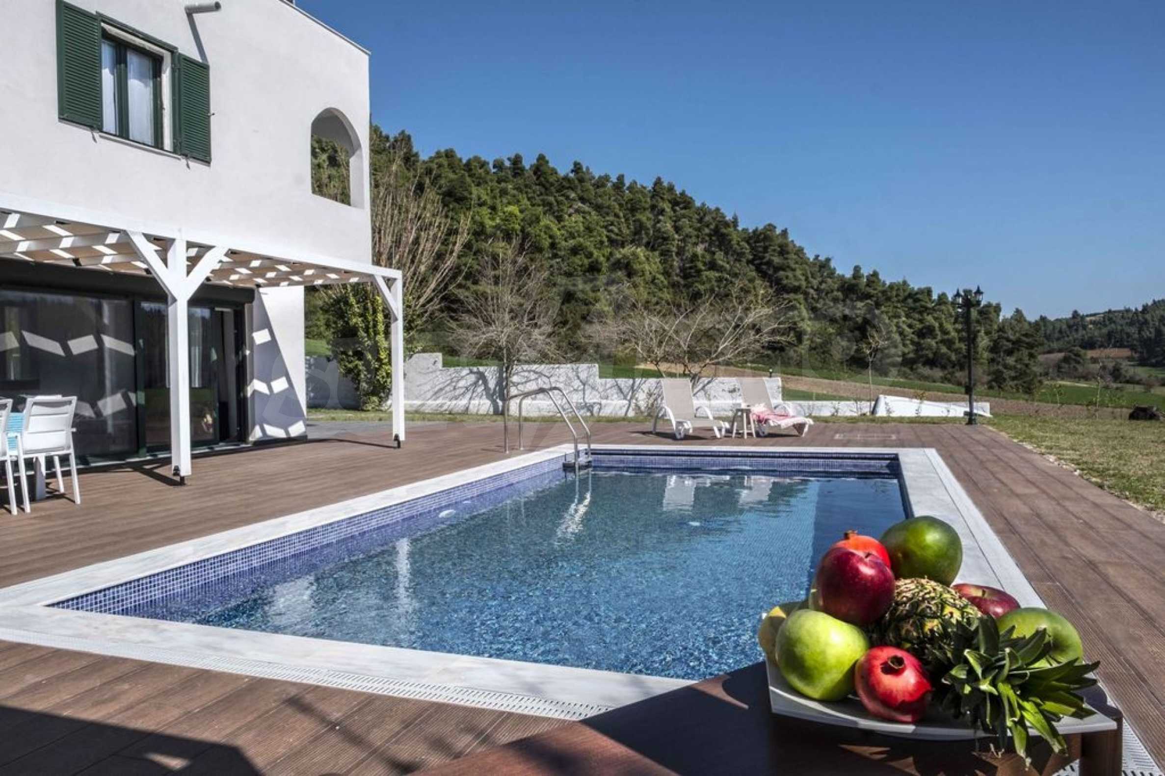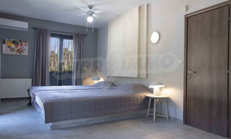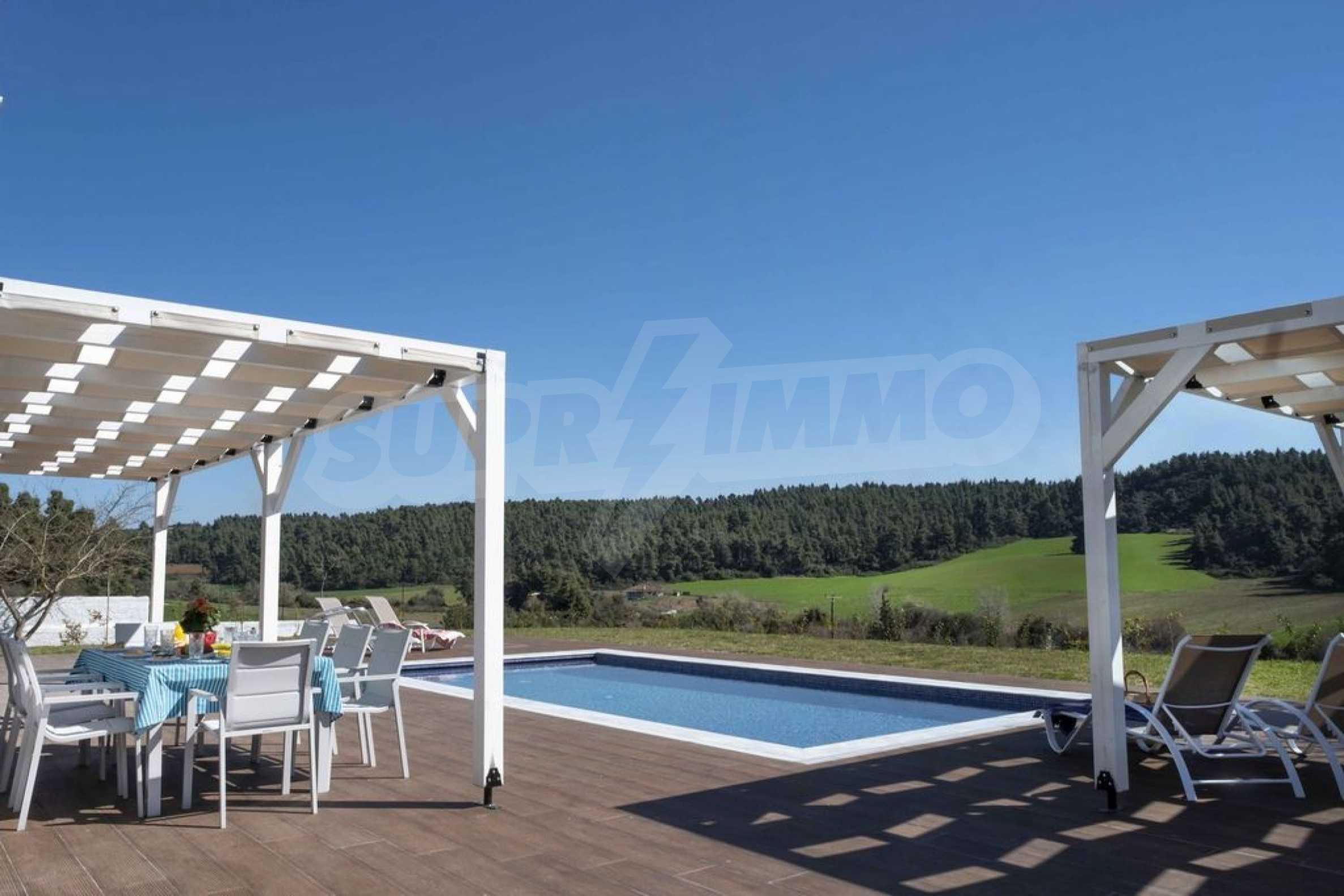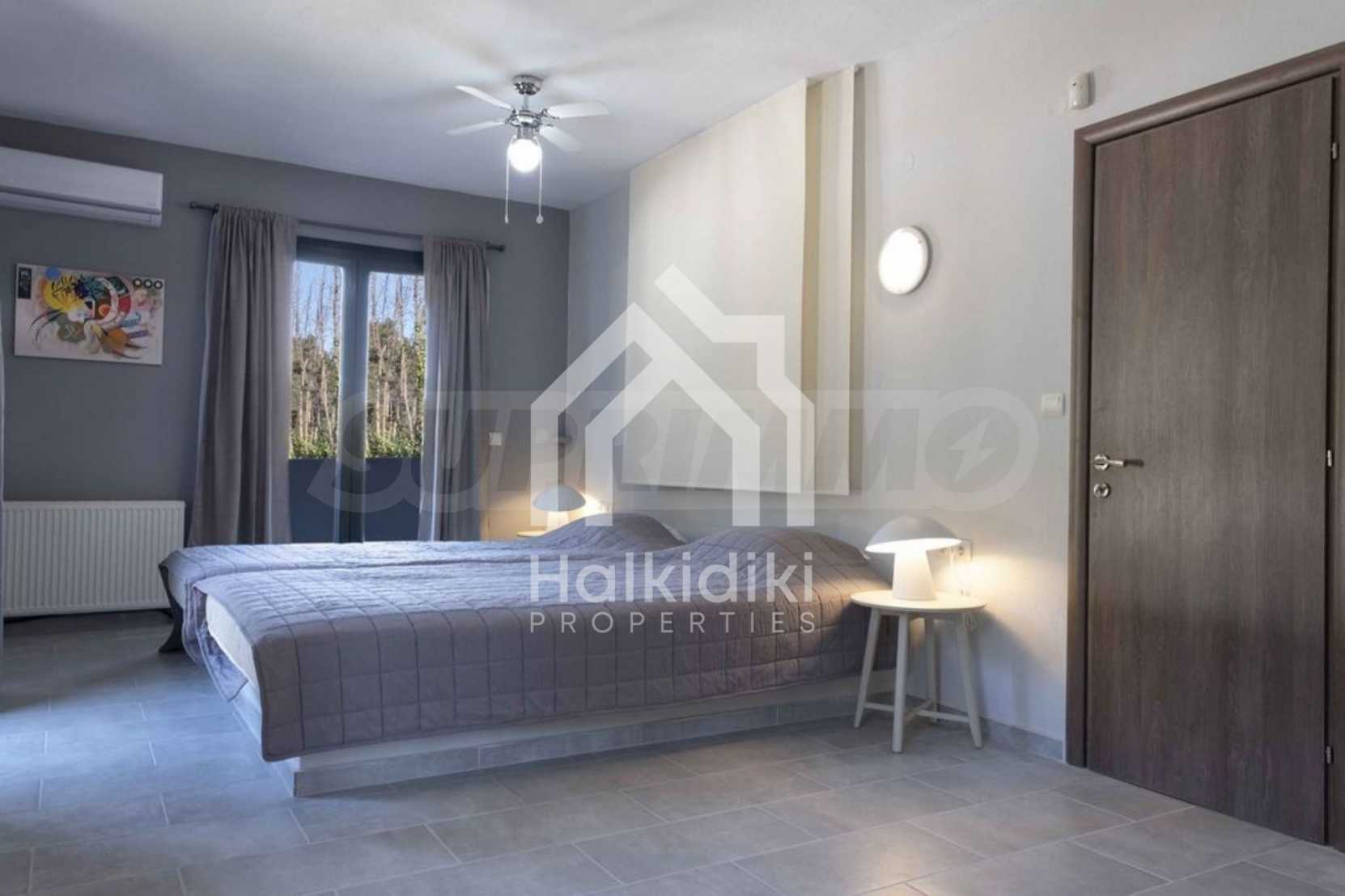 Luksusowa willa o powierzchni 220 m2 na Kasandrze na Półwyspie Chalcydyckim, w sosnowej okolicy, pięć minut od plaży. Podzielone jest na dwa poziomy, składające się z salonu połączonego z kuchnią, czterech sypialni, trzech łazienek oraz garderoby. Posiada ogród o powierzchni 5000 m2 z automatycznym nawadnianiem, aluminiową stolarką, kotłownią, pawilonem, odkrytym basenem i anteną satelitarną. Nieruchomość idealnie nadaje się pod inwestycję, jest w pełni umeblowana.