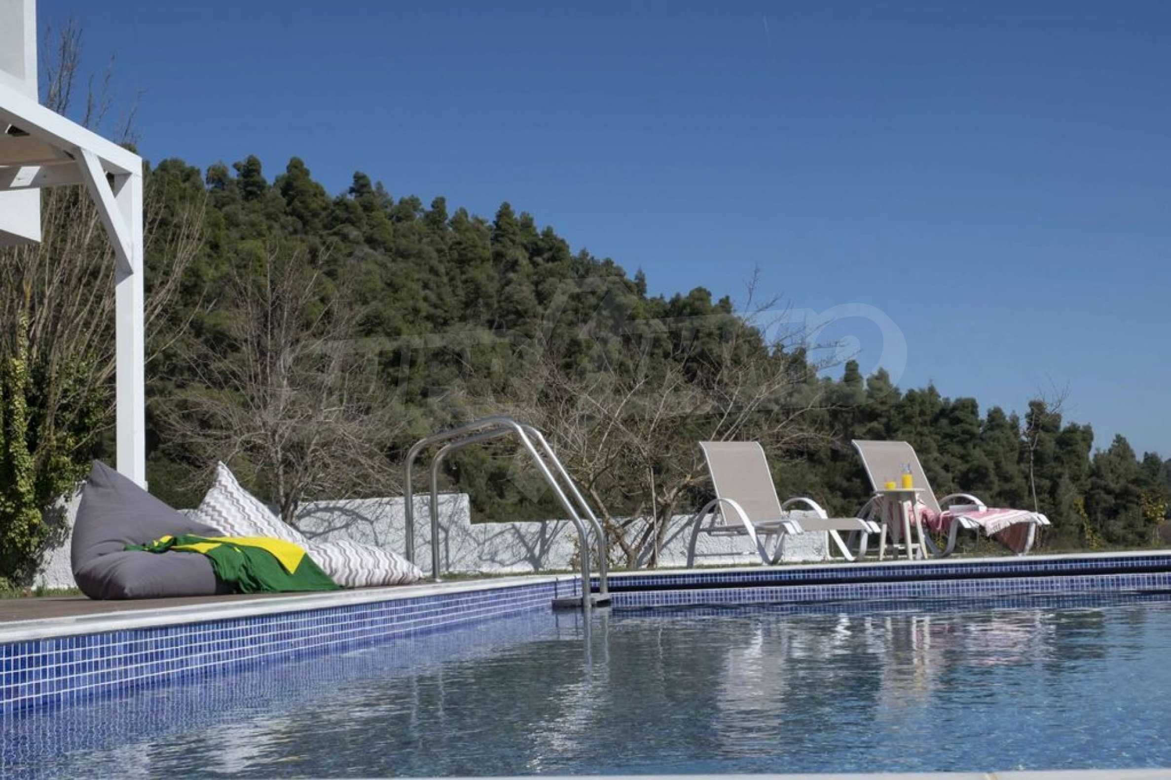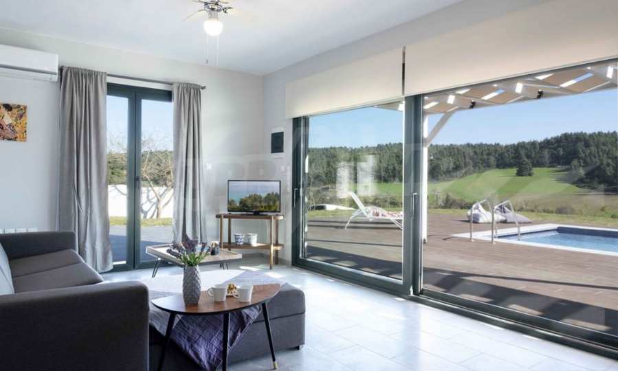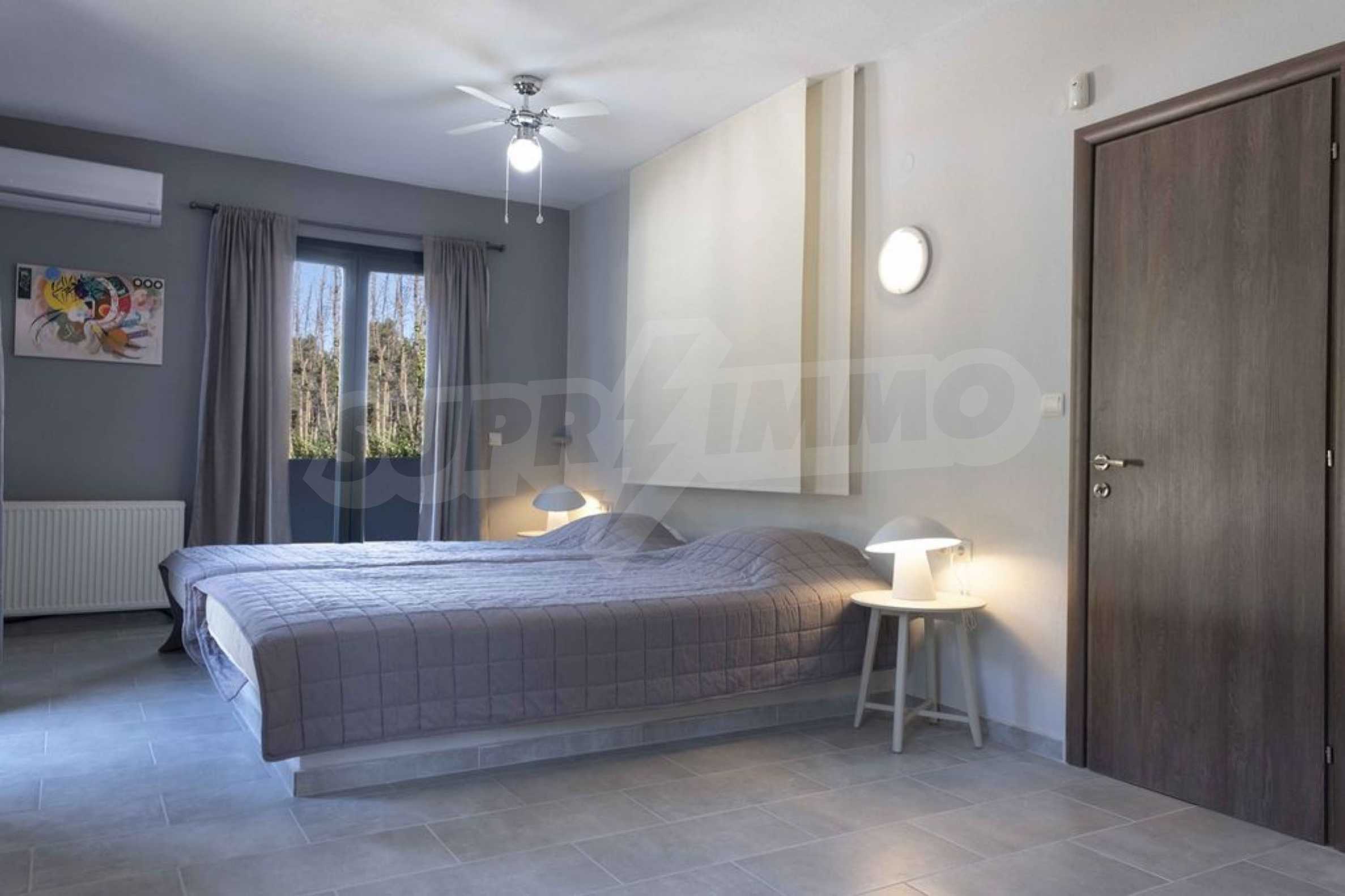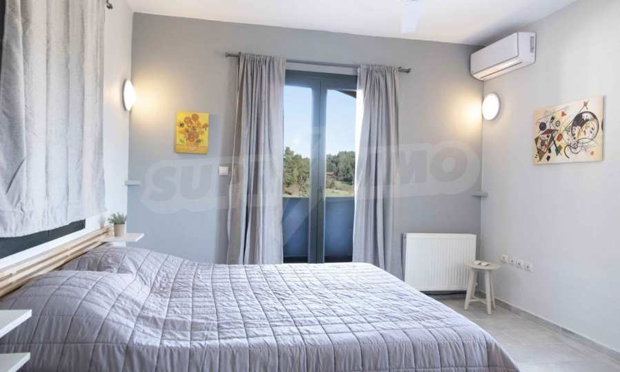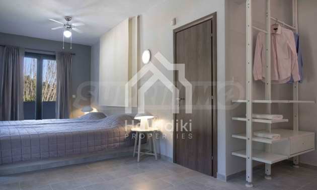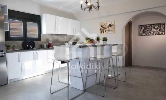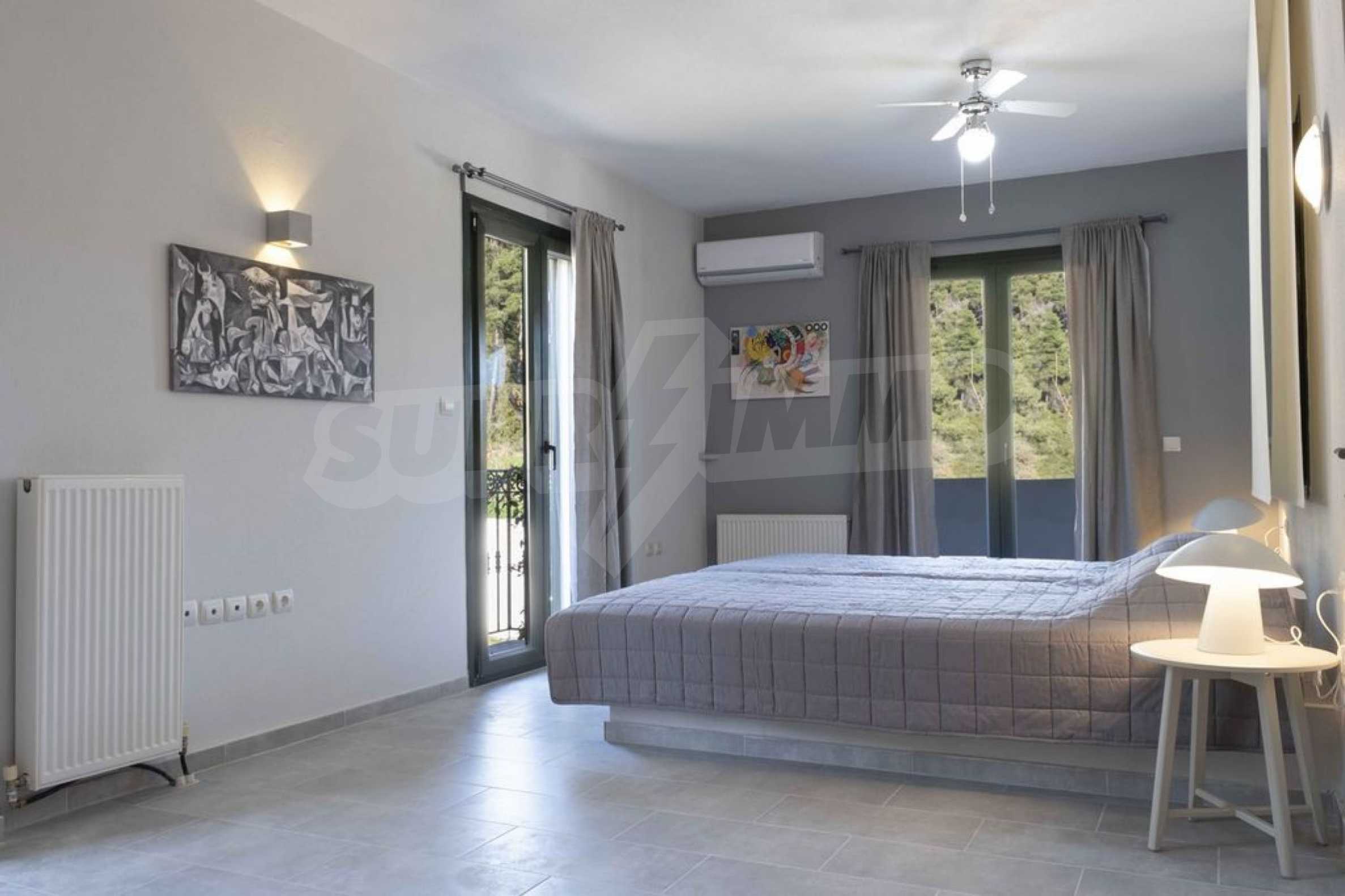 Luksusowa willa o powierzchni 220 m2 na Kasandrze na Półwyspie Chalcydyckim, w sosnowej okolicy, pięć minut od plaży. Podzielone jest na dwa poziomy, składające się z salonu połączonego z kuchnią, czterech sypialni, trzech łazienek oraz garderoby. Posiada ogród o powierzchni 5000 m2 z automatycznym nawadnianiem, aluminiową stolarką, kotłownią, pawilonem, odkrytym basenem i anteną satelitarną. Nieruchomość idealnie nadaje się pod inwestycję, jest w pełni umeblowana.