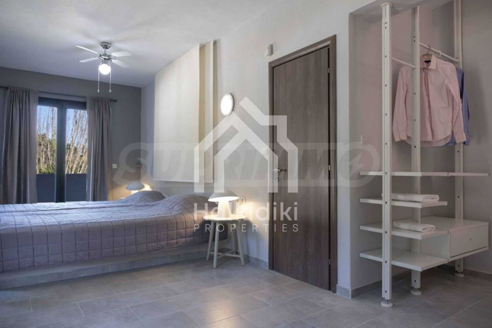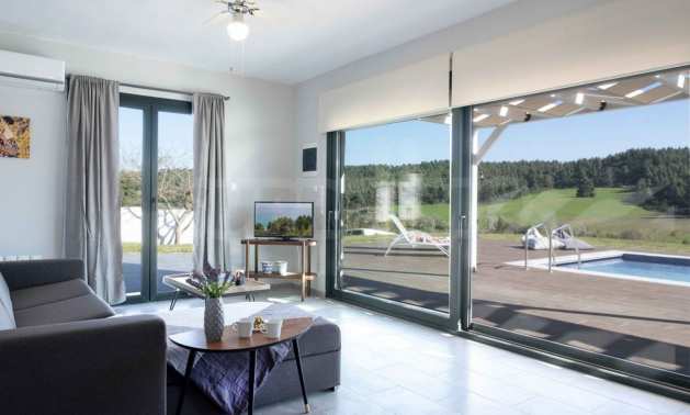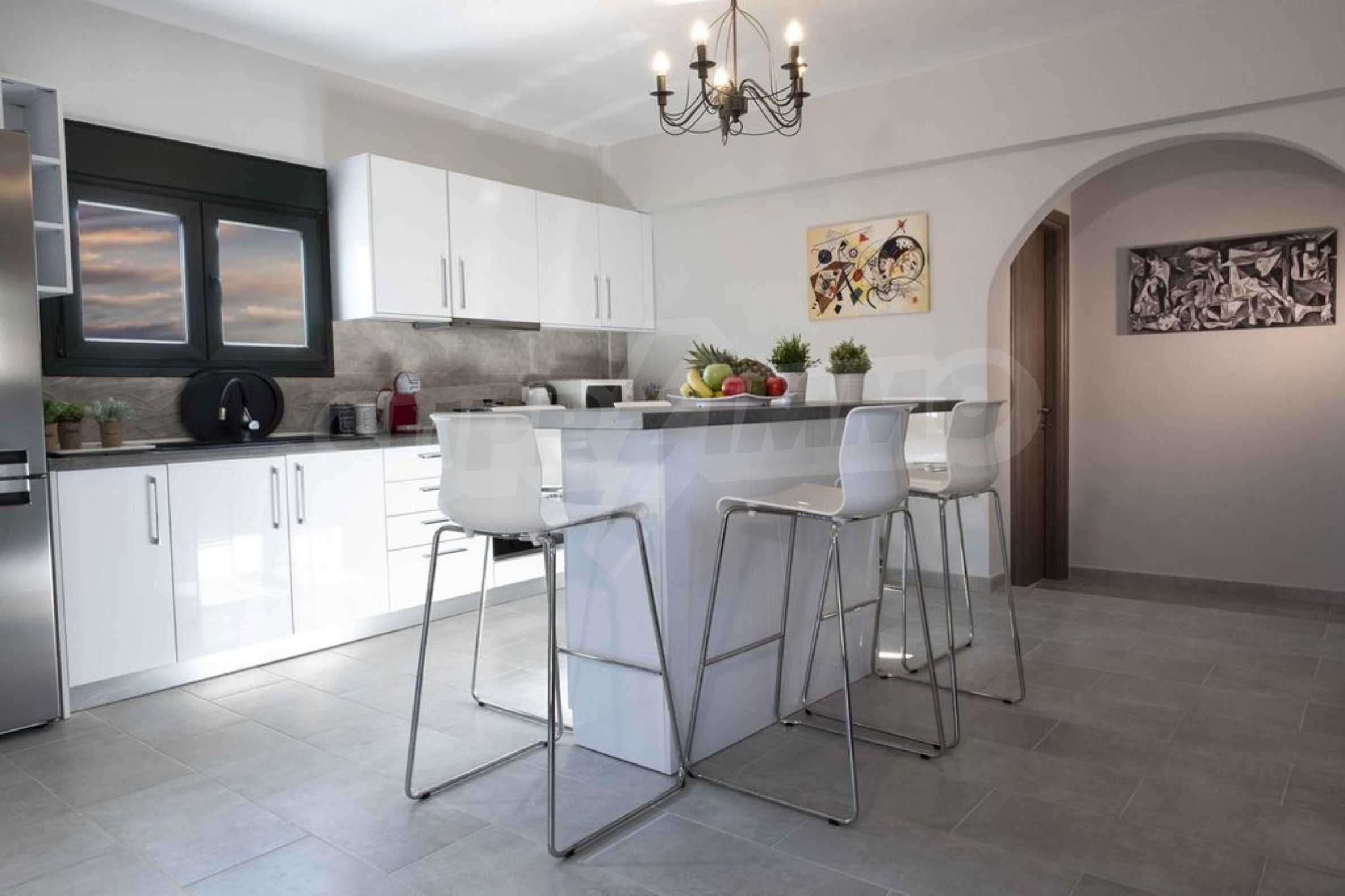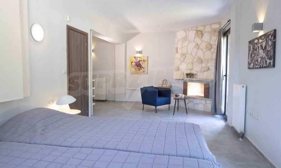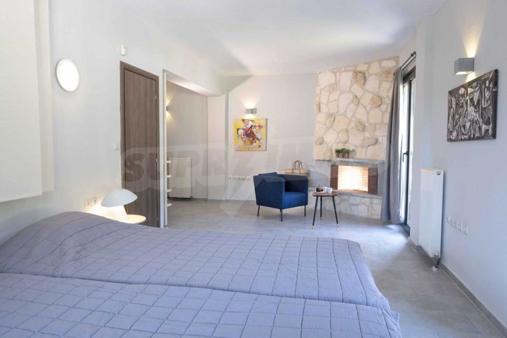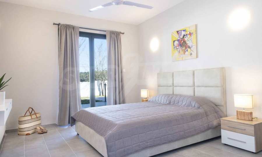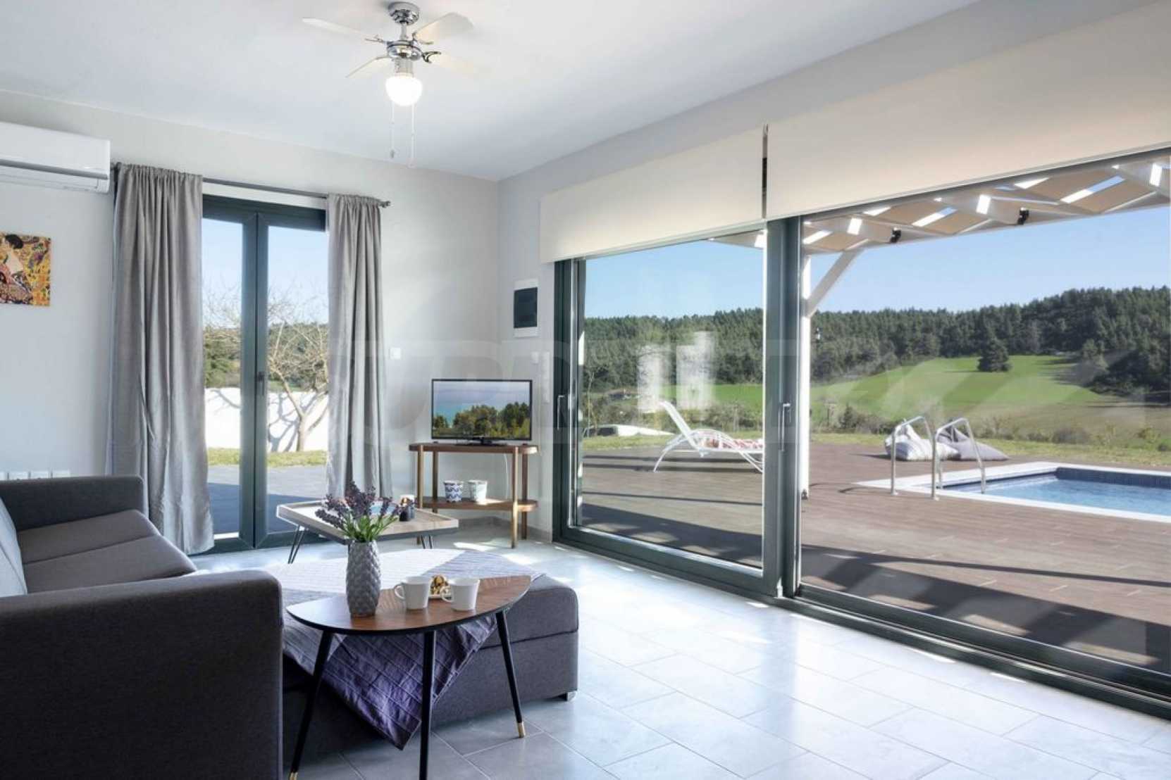 Luksusowa willa o powierzchni 220 m2 na Kasandrze na Półwyspie Chalcydyckim, w sosnowej okolicy, pięć minut od plaży. Podzielone jest na dwa poziomy, składające się z salonu połączonego z kuchnią, czterech sypialni, trzech łazienek oraz garderoby. Posiada ogród o powierzchni 5000 m2 z automatycznym nawadnianiem, aluminiową stolarką, kotłownią, pawilonem, odkrytym basenem i anteną satelitarną. Nieruchomość idealnie nadaje się pod inwestycję, jest w pełni umeblowana.