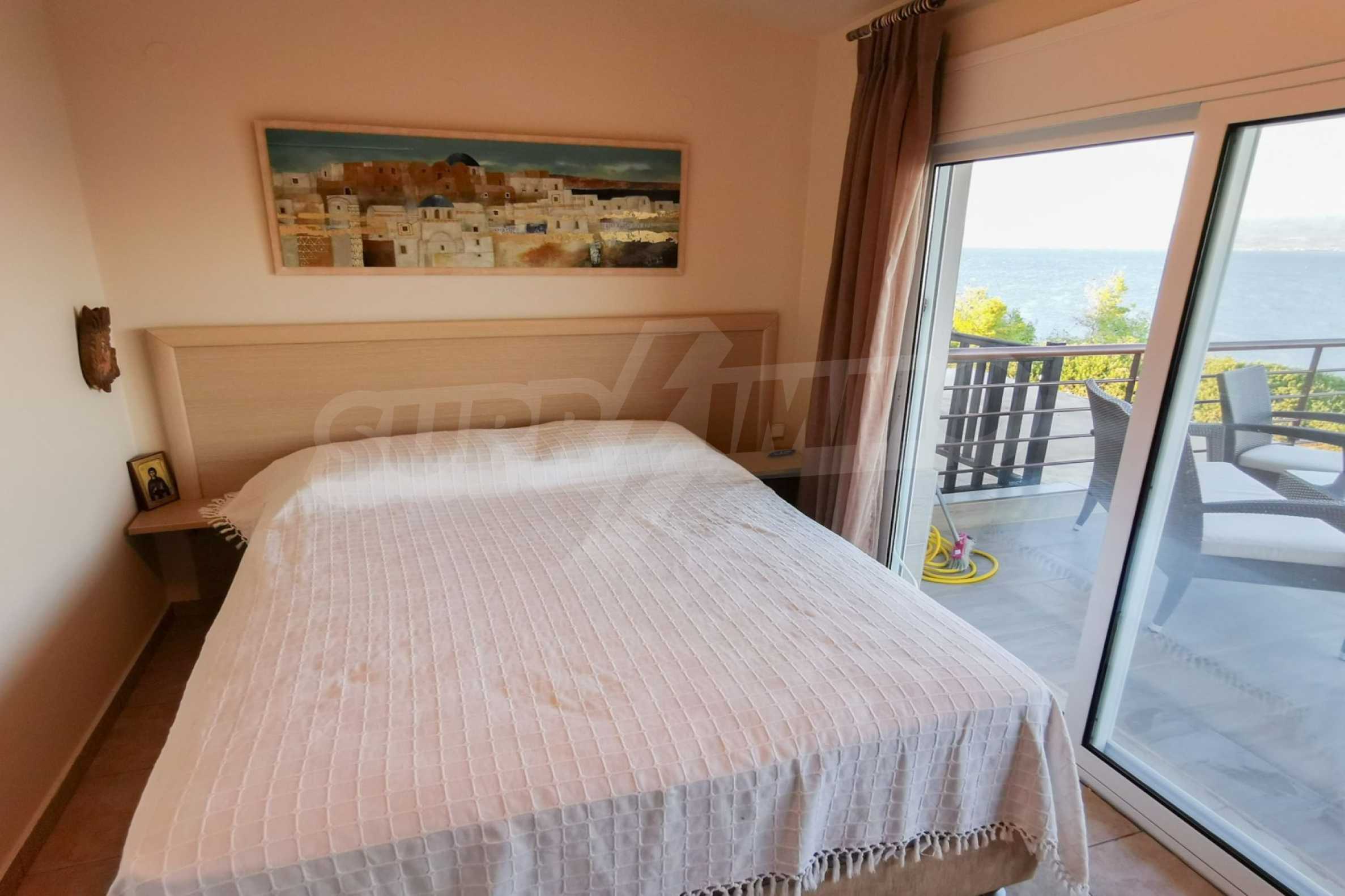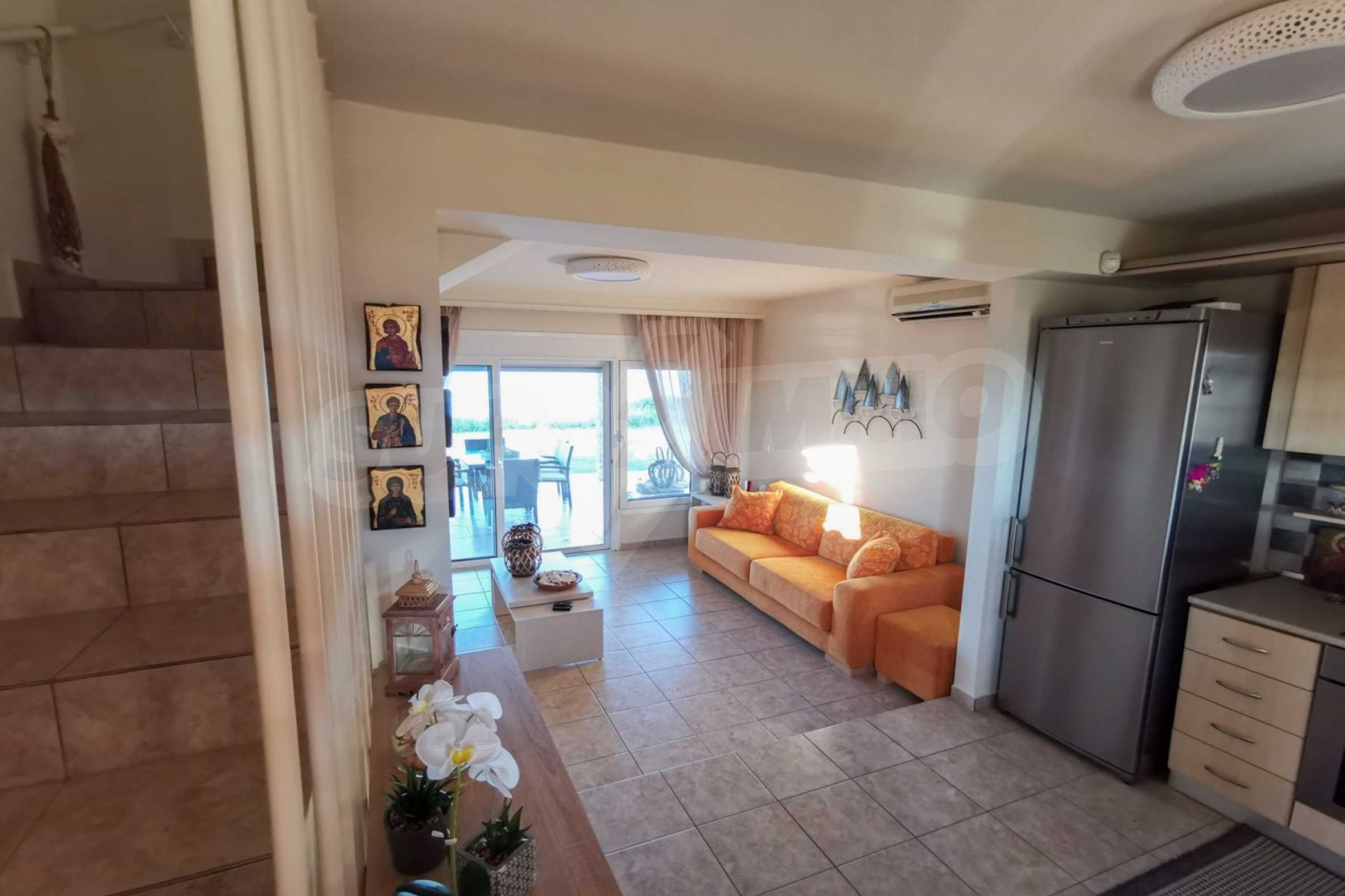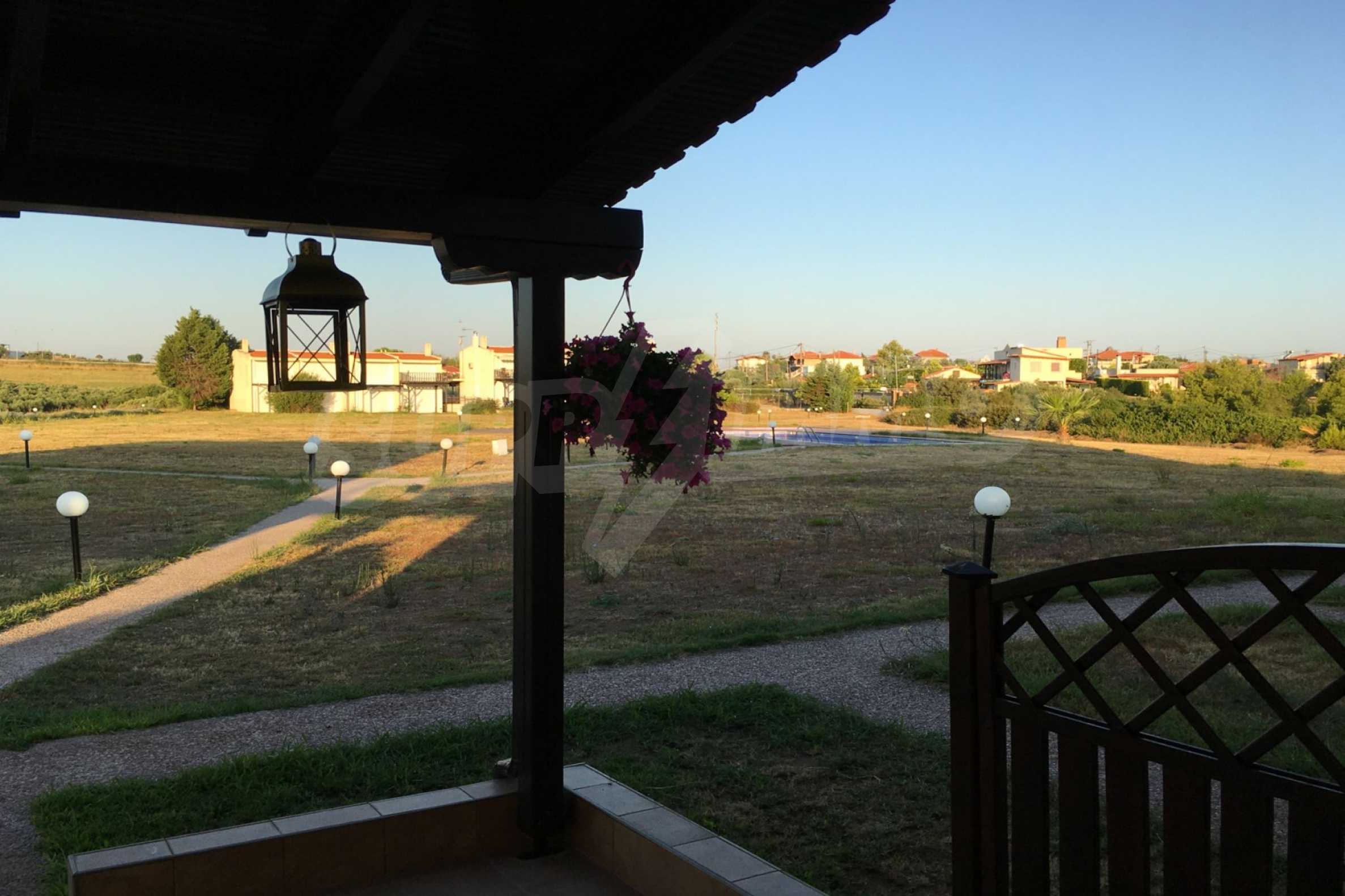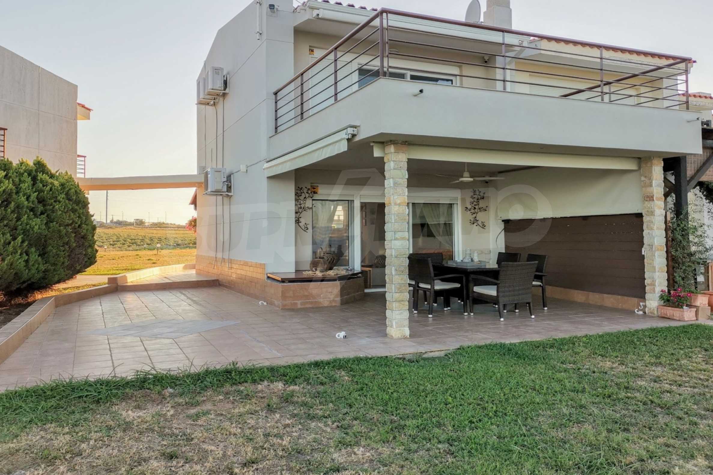 Apartament dwupoziomowy o powierzchni 90 m², pierwszy nad morzem, zbudowany na wzgórzu, z magicznym widokiem na zatokę Toronaios i zorientowany na wschód. Obiekt ma łatwy dostęp do plaży i znajduje się 1500 metrów od centrum wioski. Dwupoziomowy apartament położony jest w kompleksie sześciu domów, na 12-hektarowej działce ze wspólnym basenem. Składa się z salonu połączonego z kuchnią, trzech sypialni, dwóch łazienek i dwóch schowków. Posiada duży balkon, okna aluminiowe, podłogi z terakoty, drzwi pancerne, instalację alarmową oraz pawilon ogólnodostępny.