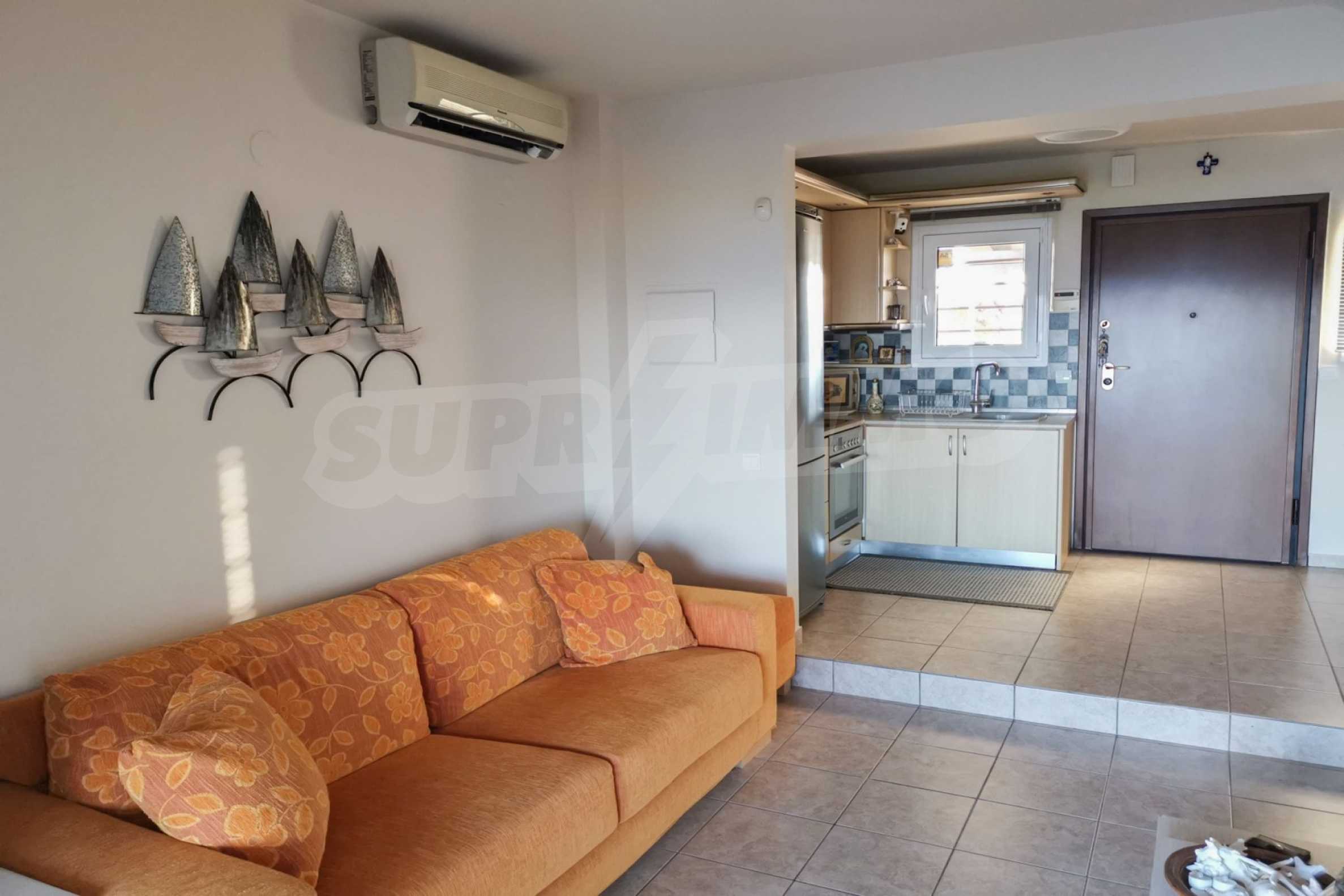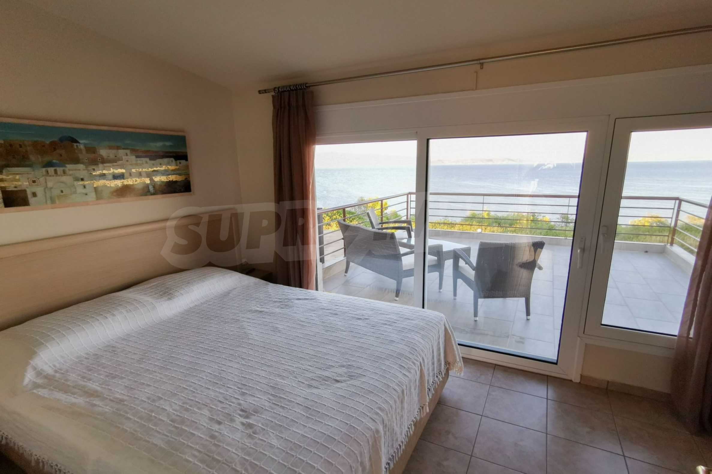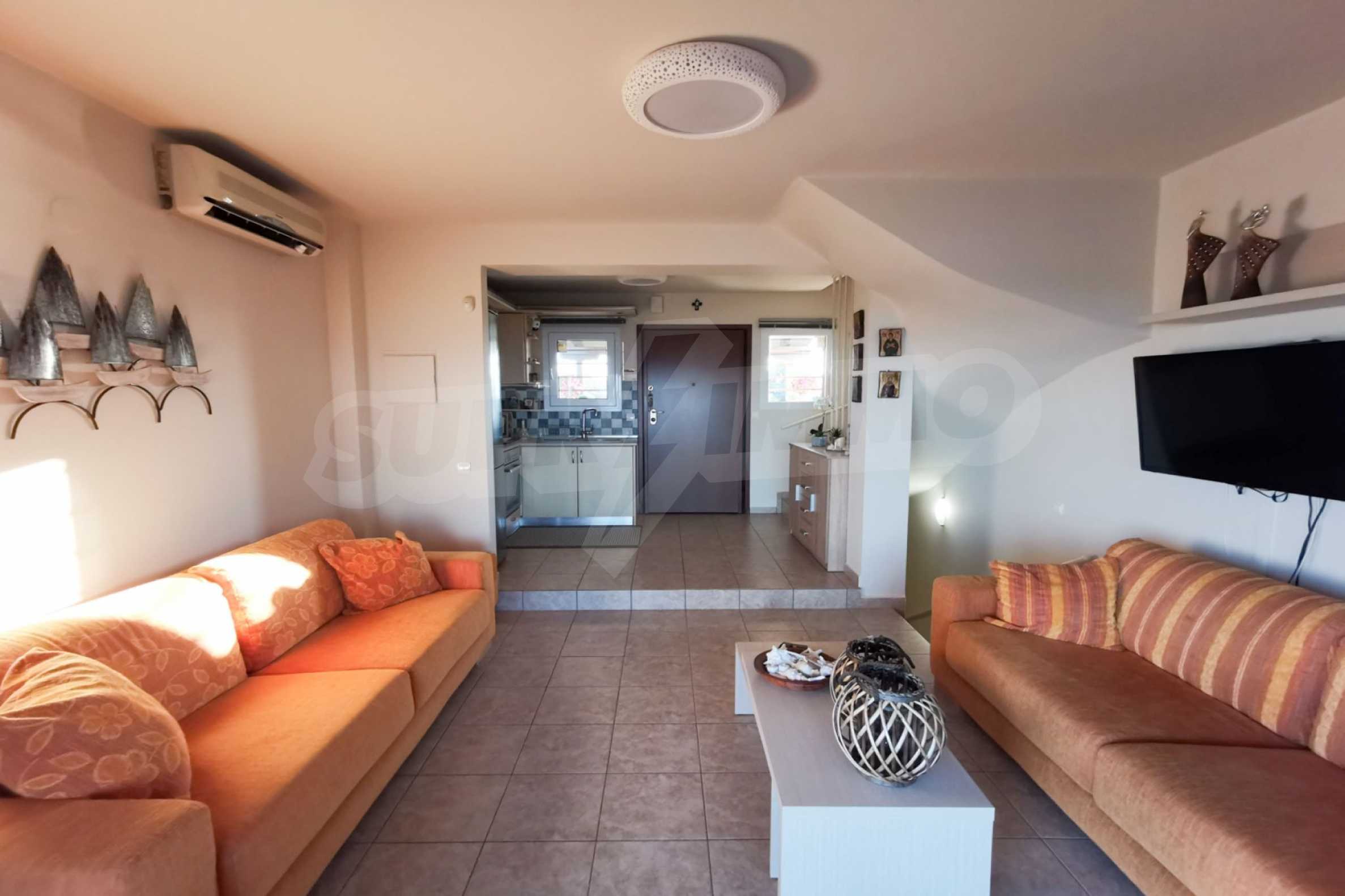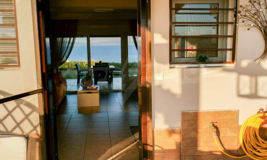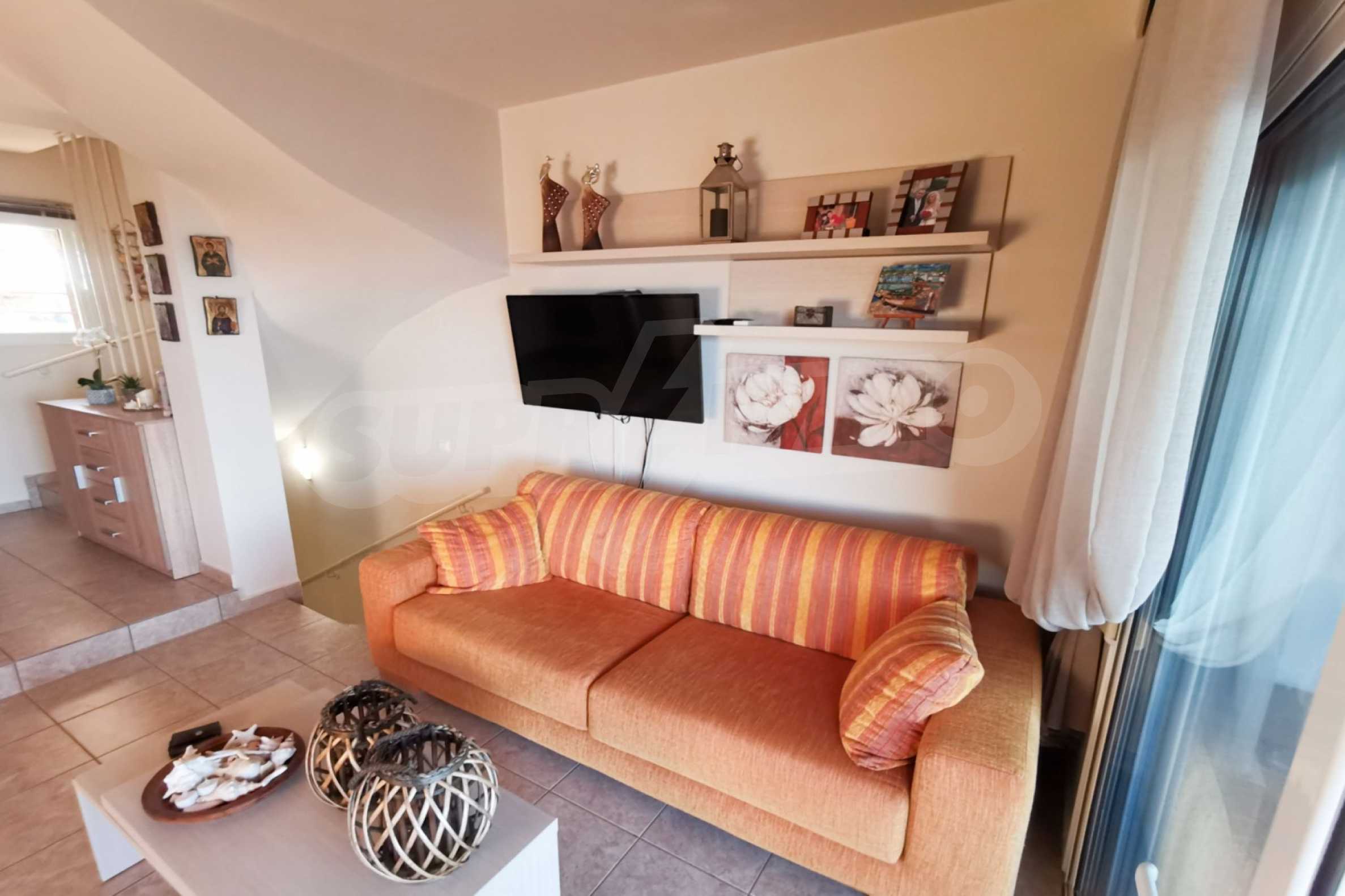 Apartament dwupoziomowy o powierzchni 90 m², pierwszy nad morzem, zbudowany na wzgórzu, z magicznym widokiem na zatokę Toronaios i zorientowany na wschód. Obiekt ma łatwy dostęp do plaży i znajduje się 1500 metrów od centrum wioski. Dwupoziomowy apartament położony jest w kompleksie sześciu domów, na 12-hektarowej działce ze wspólnym basenem. Składa się z salonu połączonego z kuchnią, trzech sypialni, dwóch łazienek i dwóch schowków. Posiada duży balkon, okna aluminiowe, podłogi z terakoty, drzwi pancerne, instalację alarmową oraz pawilon ogólnodostępny.