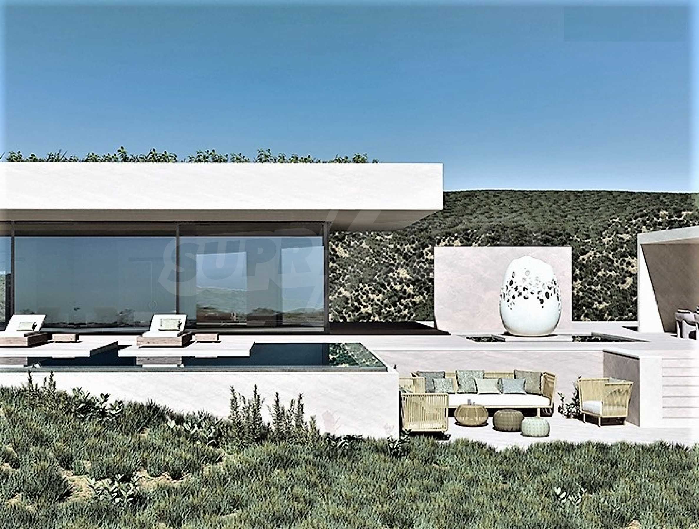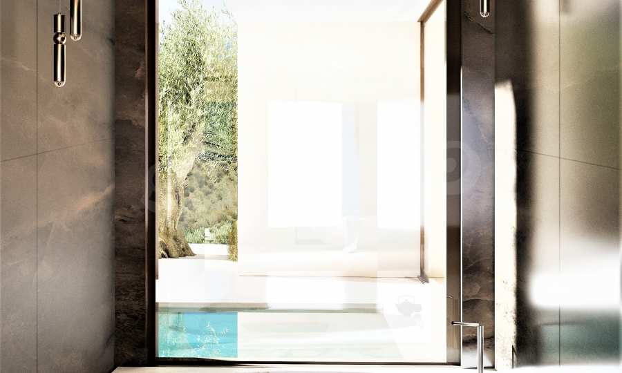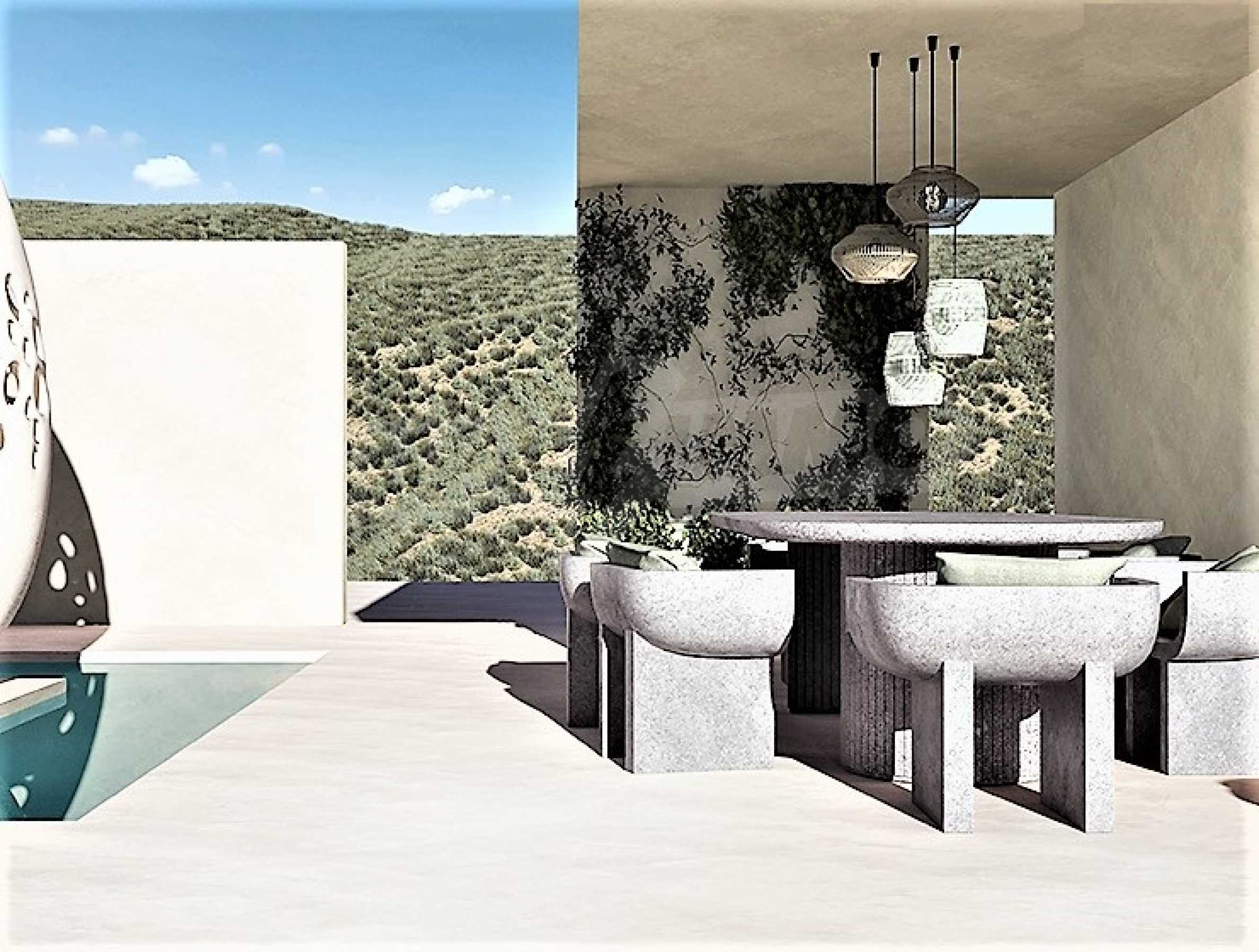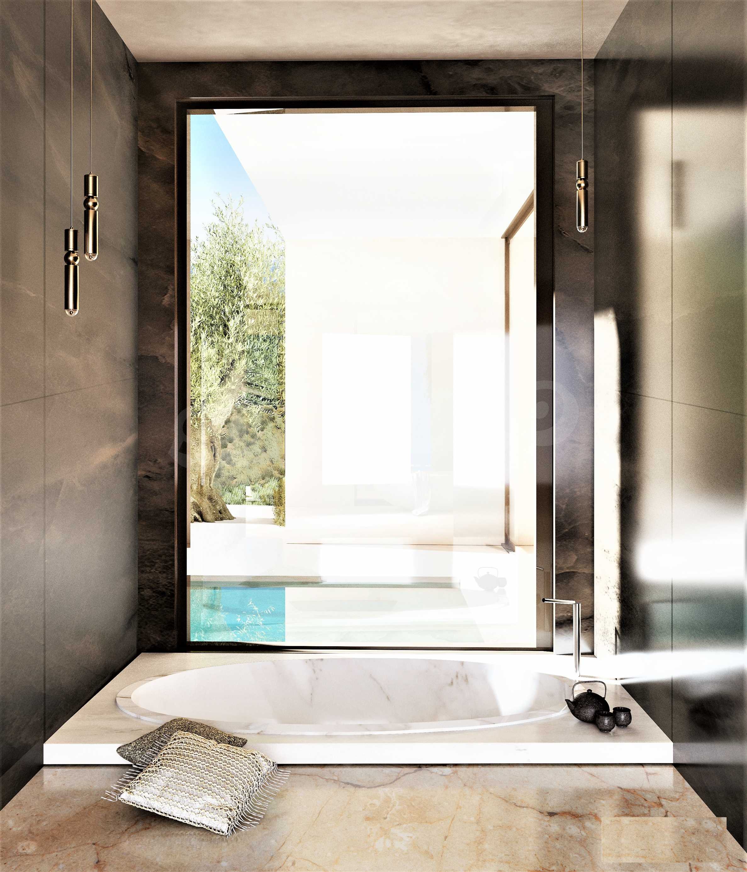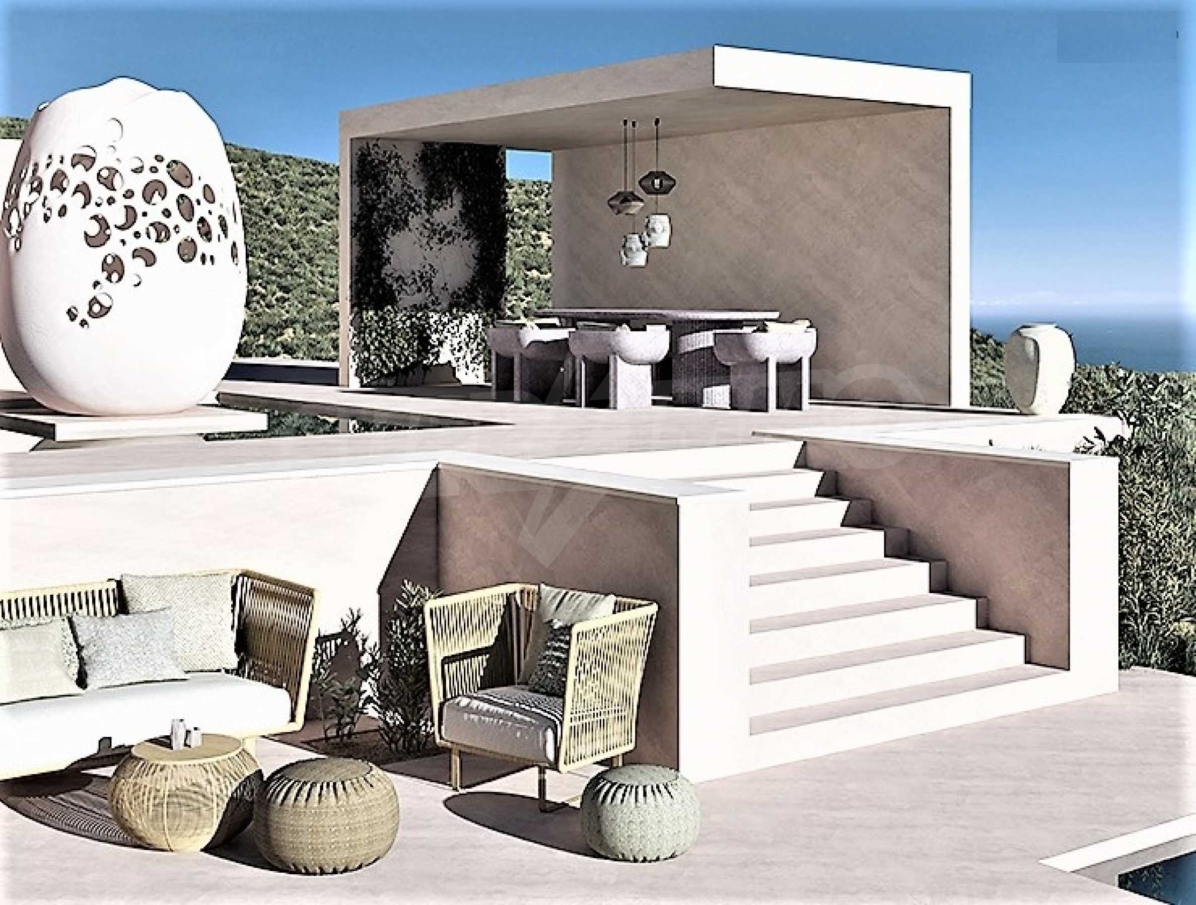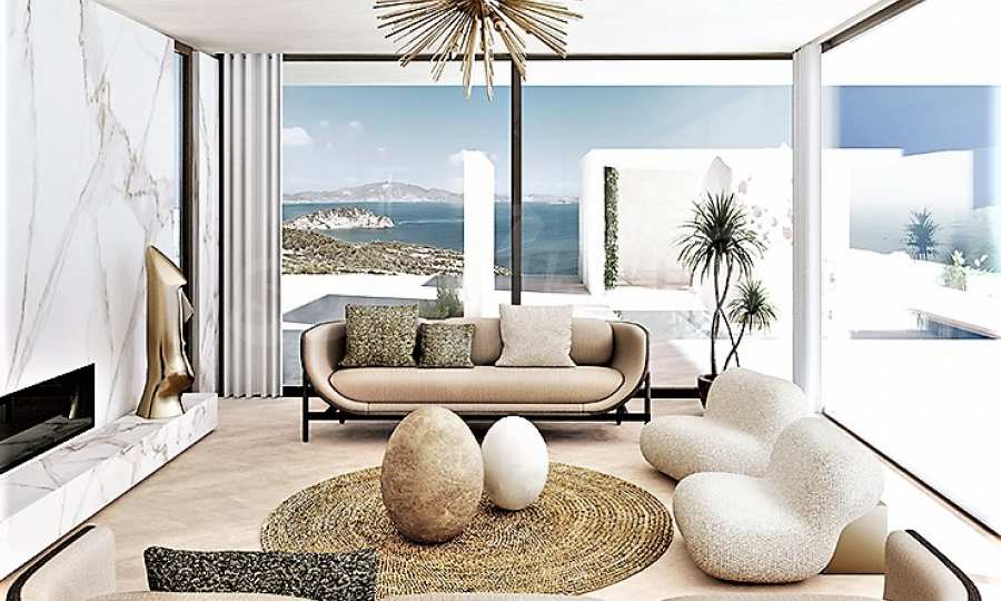 Villa Gaia została zaprojektowana z uwzględnieniem klimatu, trajektorii słońca oraz dominującego kierunku wiatru i połączona z pięknem krajobrazu. Architekt skupił się całkowicie na ludzkiej skali, od projektu krajobrazu po artykulację budynku, od przestronności wnętrza po najdrobniejszy szczegół materiałów. Basen bez krawędzi ma wymiary 18 m na 5 m i głębokość 1,60 m, z leżakami. To idealne miejsce, aby usiąść i cieszyć się widokiem na morze, ogród lub góry z koktajlem w dłoni. Mlecznoróżowe kolory, piaskowe odcienie i faktury, a także oliwkowa paleta dominują w meblach i całym wnętrzu. Dominującym elementem kompozycji jest rzeźba JAJKO. Willa składa się z szeregu zakamarków, miejsca do siedzenia w spokojny poranek obserwując wschód słońca, miejsca do zebrania się z całą rodziną na obiad w chłodzie cienia i wiatru, miejsca do kontemplacji w cieniu stuletnie drzewo oliwne, miejsce na wypicie kieliszka wina na koniec dnia z przyjaciółmi z widokiem na krajobraz Zatoki Lagana.