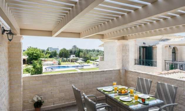 Przestrzeń zewnętrzna obejmuje werandy we wszystkich trzech domach, idealne do relaksu, podziwiając wspaniały widok na okoliczne góry, a także ogród i duży basen o powierzchni 80 m2.