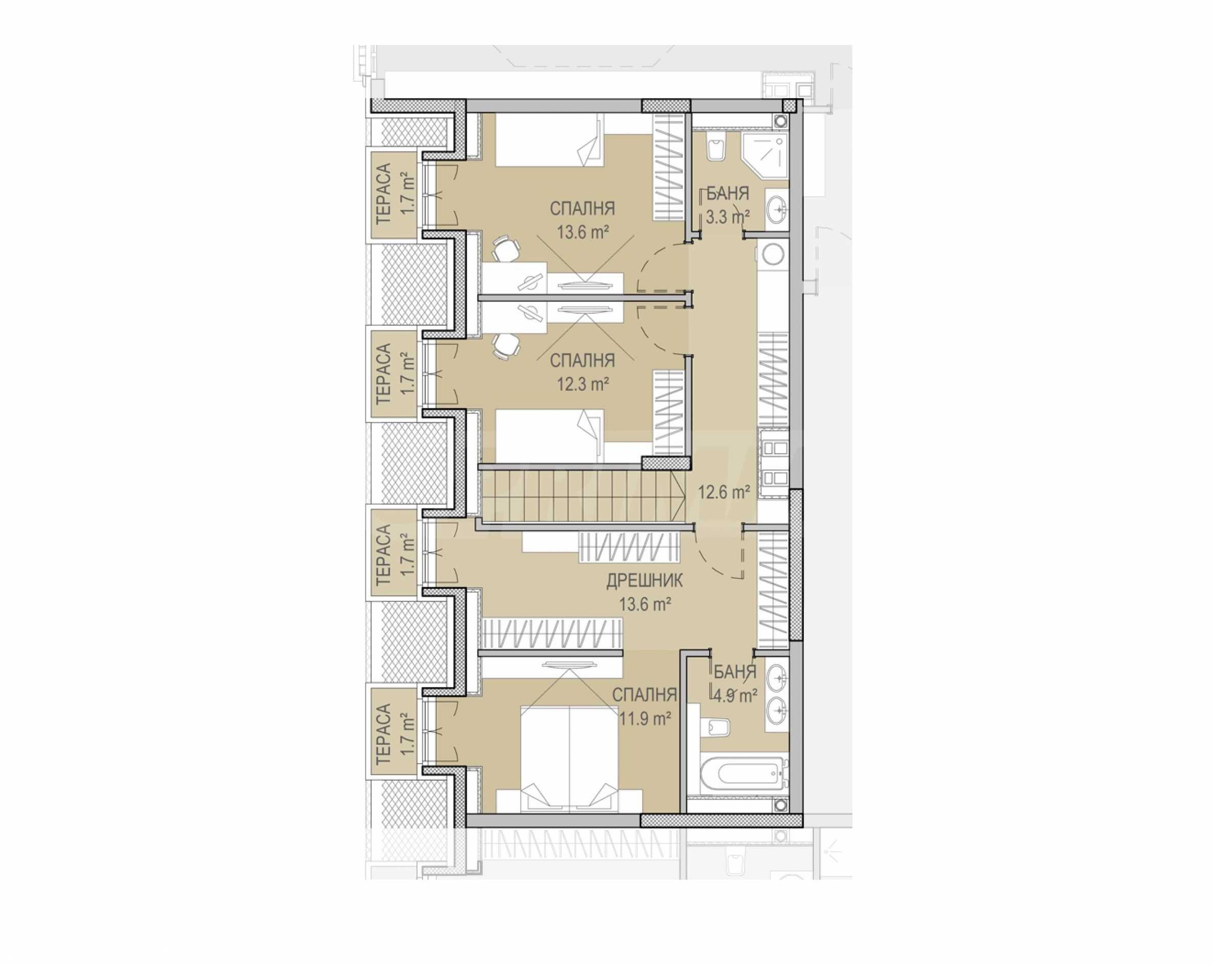 Na pierwszym piętrze znajduje się salon z aneksem kuchennym i jadalnią (39,2 m2) z wyjściem na słoneczny taras z widokiem na miasto i górę Witosza. Drugie piętro apartamentu to część „nocna” z trzema sypialniami, z których każda posiada balkon francuski. Główna sypialnia oferuje ekskluzywną zaletę jasnej i przestronnej garderoby (13,6 m2) oraz własnej łazienki z toaletą. Na tym piętrze znajduje się kolejna łazienka z WC oraz duża przestrzeń w korytarzu na montaż garderoby, pralki i suszarni.